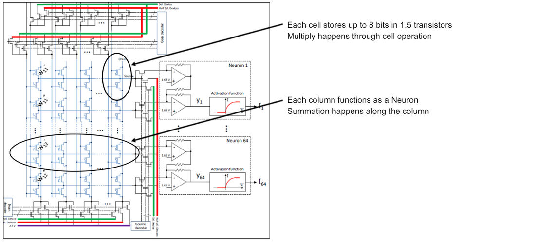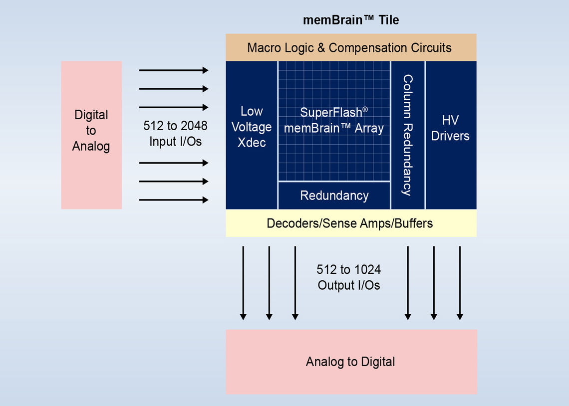 Based on SuperFlash® technology and optimized to manage Vector Matrix Multiplication (VMM) for neural network inference, our memBrain™ neuromorphic memory product improves system architecture implementation of VMM through an analog compute-in-memory approach, enhancing AI inference at the edge. Current neural net models may require 50M or more weights for processing. The memBrain neuromorphic memory product stores synaptic weights inside the floating gate to offer significant system latency improvements such as reducing system bus latencies when fetching from off-chip DRAM. When compared to traditional digital DSP and SRAM/DRAM based approaches, it delivers 10 to 20 times power reduction and significantly lower cost with improved inference frame latency.